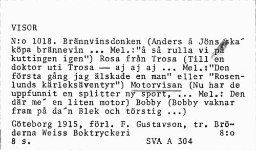 //// VISOR //// N:o 1018. Brännvinsdonken (Anders å Jönsifska" köpa brännevin ... Mel.:"å så rulla vi pä kuttingen igen") Rosa från Trosa (Till?en doktor uti Trosa — aj aj aj ... Mel.j"Den första gång jag älskade en man" eller "Rosenlunds kärleksäventyr") Motorvisan (Nu har de uppfunnit en splitter ny"*spdrt, '"... Mel.r Den där me" en liten motor) Bobby (Bobby vaknar fram på da"n Blek och törstig ...) //// Göteborg 1915, förl. F. Gustavson, tr. Bröderna Weiss Boktryckeri 8:0 8 s. SVA A 304 ////