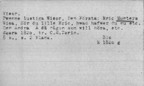 //// •Viner. //// IVenne lustiga Wifor, Den feersta: -Eric Monters Wisa, Hör du lille Eric, hwad hafwer du' ru" etc . Der ^ndra Ä dä någon som w$Il höra, etc. 3ieara IB2b, tr. C.M.Torin. 8 s», s, 2 fcl&nic. 8:o //// & l82o g ////