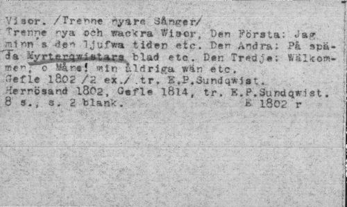 //// Yisor. /Trevna ryare Sånger/ //// ?r«me ^ya ®éh vackra Wiscr, "Den Första: Ja*, ra t nn's Ijufwa tider etc. Der Andra: På apä- //// "Ja etc . D«n Tredje; Wälieow- //// -sfnpo Mår»! tn åldriga wän etc. ."fefle l802 /2 ex./ .tr, E.P,3undq*Jat. Herresand 1802, G«fl« lBl4, tr. K. P.Suntiqwist. 8 9. . s. 2 blan*. * lS02 r ////
