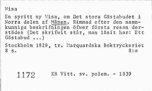 //// Wisa //// En spritt ny Wisa, om Det stora Gästabudet i Norra delen af Månen. Rimmad efter den namnkunniga beskrifningen öfwer första resan der-städes (Det skrifwit står, man läsit har: Ett Gästabud ..,) //// Stockholm 1829, tr. Marquardska Boktryckeriet 8 s.. 8:0 //// 1172 XB Vitt. sv. polem. - 1S39 ////
