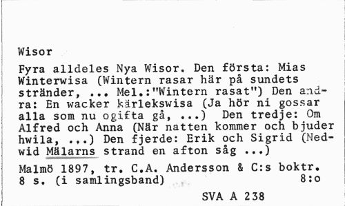 //// Wisor //// Fyra alldeles Nya Wisor. Den första: Mias Winterwisa (Wintern rasar här på sundets stränder, ... Mel.:"Wintern rasat") Den andra: En wacker kärlekswisa (Ja hör ni gossar alla som nu ogifta gå, ...) Den tredje: Om Alfred och Anna (När natten kommer och bjuder hwila, Den fjerde: Erik och Sigrid (Ned- //// wid Mälarns strand en afton såg ...) //// Malmö 1897, tr. C.A. Andersson & C:s boktr. 8 s. (i samlingsband) 8:0 //// SVA A 2 38 ////