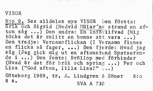 //// VISOR //// N:o 9. Sex alldeles nya VISOR Den första: Erik och Sigrid (Nedvid Mälarens strand en afton såg ...) Den andra: En inföllifvad (Mig töcks det är rolitt en bonne att vara ...) Den tredje: Vernamoflickan (I Vernamo finnes en flicka så fager, ...) Den fjerde: Hvad jag såg (Jag gick mig ut en aftonstund Spatseran-de i ...) Den femte: Bröllop med förhinder (Hvad är det för bråk och spring .,.) Per och Lisa ("God afton, lilla Lisa.*" ...) //// Göteborg 1909, tr. A. Lindgren & Söner 8:0 //// 8 S* SVA A 730 ////