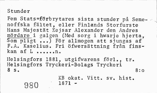 //// Stunder //// Fem Stats=förbrytares sista stunder på Seme-noffska fältet, eller Finlands Storfurste Hans Majestät Xejsar Alexander den Andres mördare i galgen (Med sorg i hwarje hjerta, Som pligt ...) För allmogen att sjungas af F.A. Kaselius. Fri öfwersättning från finskan af L...n. //// Helsingfors 1881, utgifv/arens förl., tr. Helsingfors Tryckeri-Bolags Tryckeri 8 s. 8:0 //// XB okat. Vitt. sv. hist. //// 980 1871 - ////