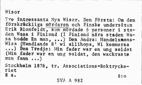 //// Wisor //// Tre intressanta Nya Wisor. Den Första: Om den förskräckliga mördaren och Finske undersåten Erik Blomfeldt,som mördade 6 personer i staden Wasa i Finland (I Finland nära staden Wasa bodde In man, ,..) Den Andra: Handelsmans-Wisa (Handlande ä' wi allihopa, Wi kommersa <...) Den Tredje: Min fader war en ung soldat (Min fader war en ung soldat, den wackraste man fann ...) //// Stockholm 1876, tr. Associations=Boktrycke-riet //// 8 s. 8:o //// SVA A 982 ////