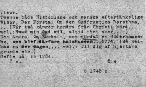 //// /isor. //// Fwenne både Hiatoriske oeh ganska eftertänkelige Visor, Den Företa: Om den Dudfrugtisa Derothea, ...(Där ttrå sånger hundra från Christi börd.., sel.:Hwad min.^d Wil, altid thet sker,...} Den Andra: Orq Sur ka 11som mördat en 3öderha»H8» be, blef €&rf»re halehu«*FeWr. .1774, [ SS nal-«*e nu 4en tagen,... nel.i Til dig af hjartans »runde etc.) Sefle uå, ib l??4 //// ft «. - //// s' 1746 c ////