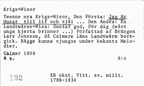 //// Krigs=Wisor //// Twenne nya Krigs=Wisor, Den Första: Jag är Husar till lif och själ ... Den Andra: En Landtwärns=Wisa: Gustaf god, För dig (wårt unga hjerta brinner ...) Författad af Drängen Lars Jonsson, då Calmare Läns Landtwärn bortgick. Bägge kunna sjungas under bekanta Melodier. //// Galmar 180 8 //// t 8:0 //// 188 KB okat. Vitt. sv. milit. //// 1788-1834 ////