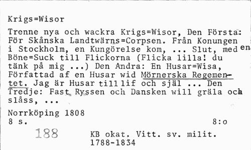 //// Krigs=Wisor //// Trenne nya och wackra Krigs=Wisor, Den Första: För Skånska Landtwärn.s =Corpsen. Från Konungen i Stockholm, en Kungörelse kom, ... Slut, medei1 Böne=Suck till Flickorna (Flicka lilla! du tänk på mig ...) Den Andra: En Husar=¥isa, Författad af en Husar wid Mörnerska Regementet. Jag är Husar tilllif och själ ... Den Trecfj e: Fast, Ryssen och Dansken will gräla och slåss, ... //// Norrköping 1808 //// 8 s. 8:0 //// 188 KB okat. Vitt. sv. milit. //// 1788-1834 ////