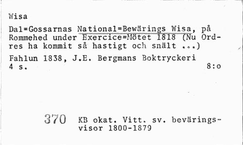 //// Wisa //// Dal=Gossarnas National=Bewärings Wisa, på Rommehed under Exercice=Mötet 1818 (Nu Ordres ha kommit så hastigt och snält .„.) //// Fahlun 1838, J.E. Bergmans Boktryckeri 4 s. 8 : o //// 370 KB okat. Vitt, sv. bevärings- //// visor 1800-1879 ////