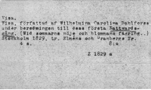 //// Visa. //// Wi»n, författad af Wilhelmina Carolina Pahlforss under beredwingen till dess första Nat^wards-gång. (Wid sommarns nöje cch blommans fägring..) Stockholm 1Ö29, tr. Elraéns och aranbers:s Tr. 4a. 8;o //// Z 1829 a ////