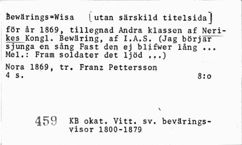 //// Bewärings=Wisa [utan särskild titelsida] //// för år 1869, tillegnad Andra klassen af Neri-kes Kongl. Bewäring, af I.A.S. (Jag börjar sjunga en sång Fast den ej blifwer lång ... Mel.: Fram soldater det ljöd ...) //// Nora 1869, tr. Franz Pettersson 4 s. 8: o //// KB okat. Vitt. sv. bevärings- //// Visor 1800-1879 ////