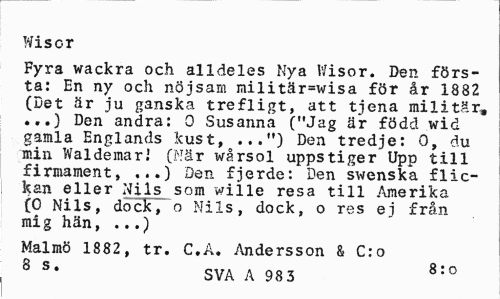//// Wisor //// Fyra wackra och alldeles Nya Wisor. Den första: En ny och nöjsam militär=wisa för år 1882 (Det är ju ganska trefligt, att tjena militär, ...) Den andra: Q Susanna ("Jag är född wid gamla Englands kust, ...") Den tredje: 0, du min WaldernarJ (När wårsol uppstiger Upp till firmament, ...) Den fjerde: Den swenska flickan eller Nils som wille resa till Amerika (0 Nils, dock, o Nils, dock, o res ej från mig hän, ...) //// Malmö 1882 , tr. C.A. Andersson & C:o 8 S# SVA A 98 3 8:0 ////