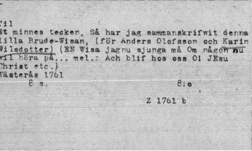 //// il //// it minnes tecken, Så har jag sanrcanskrifwit denna illa Brude-Wisan, (för Anders Olofsson och Karin filsdotter ] (EN Wisa jag nu sjunga må Om nå^éf» Äu" 'iTTorapa, .. mel.; Ach blif hos oss 01 JEsu 'hri st etc J 'ästerås 1761 //// c s. 8;o //// ? //// Z 1761 fc ////