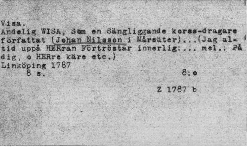 //// Visa. //// Andelig WISA, Söm en Sängliggande koras-dragare författat tgäfett UXXSJop i Måraäter).. . (Jag al-tid uppa HERran Fortröatar innerlig;... mel.; ?å dig, o HERre käre etc.) Linköping 1787 //// 8 s. 8; • //// Z 1787 b ////