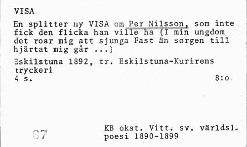 //// VISA //// En splitter ny VISA om Per Nilsson, som inte fick den flicka han ville "Ka (I min ungdom det roar mig att sjunga Fast än sorgen till hjärtat mig går ...) //// Eskilstuna 1892, tr. Eskilstuna-Kurirens tryckeri //// 4 s. 8:0 //// , KB okat. Vitt. sv. världs 1» //// , / poesi 1890-1899 ////