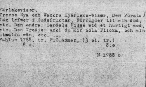 //// t* Xnit sv IL & ox*• //// trenne Nya oéh Wackra Kjärleks-Wi»»r, Den. Första Fäg lefwer i 3udefruktan, Förnogder til min död, »tn. Den Andra; Sandals Nisse wid et hurtigt mod, 51 g » Den Tredje; Acki du min ädla Flicka, och «in ltwalda wän, etc. ... i //// ?afclun 1758, tr. P.O.axmär, (3 ol. tr.) //// 8 a. 8: • //// N 178» b ////