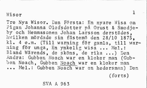 //// Wisor 1 //// Tre Nya Wisor. Den Första: En nyare Wisa om Pigan Johanna Olofsdotter nå Orust & Smedje-by och Hemmasonen Johan Larsson derstädes, hwilken mördade sin fästemö den 28/10 1875, kl. 4 e.m. (Till warning för gamla, till war-ning för unga, En ynkelig wisa ... Mel.: Bland Wärends, de sköns, de rika ...) Den Andra: Gubben Noach war en kloker man (Gubben Noach, Gubben Noach war en kloker man ... Mel.: Gubben Noach war en hedersman) Den //// (forts) //// SVA A 96 3 ////