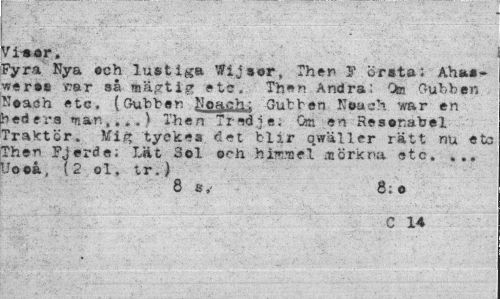 //// Visor . //// Fyra Nya och lustiga Wijsor, Then 5* Örsta* Ahas- //// weroe y?ar så »ägtig etc, Then Andra". Oa Gubben Noach etc. (Gubben No^Vj- Gubben Kaach mr en hed era <na-n,...) Then Tredje. Om en Resonabel Traktör» Sfig tyckea det blxr qwäller rätt nu etc Then Fjerde; Lät Sol och himmel mörkna etc. ... Uooå, (2 el, tr.) //// 8 s,- 8; o //// C 14 ////