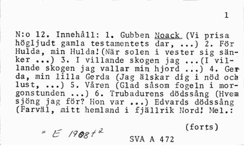 //// 1 //// N:o 12. Innehåll: 1. Gubben Noack (Vi prisa högljudt gamla testamentets dar, ...) 2. För Hulda, min Hulda!(När solen i vester sig sänker ...) 3. I villande skogen jag ...(I villande skogen jag vallar min hjord ...) 4. Ger da, min lilla Gerda (Jag älskar dig i nöd ocö lust, ...) 5. Våren (Glad såsom fogeln i morgonstunden ...) 6. Trubadurens dödssång (Hvem sjöng jag för? Hon var ...) Edvards dödssång (Farväl, mitt hemland i fjällrik Nord! Mel.: //// ^ (forts) //// t /9®g y SVA A 4 72 ////
