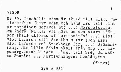 //// 1 //// VISOR //// N: 39. Innehåll: Adam är skuld till allt. Wa-riete-Wisa (Herr Adam och hans fru till slut ur paradiset derfvos ut; ...) Nordpolsvisa^ om Andre (Ni har väl hört om den stora idén, som skall utföras af herr Andrén? ...) Liss Olof Larsson till Stockholm for (Och Liss Olof Larsson te' Stockholm for, ...) Sjömanssång. Min lille Edvin skall från mig ... Zi-genargossens klagan Långt till Syd, du sköna Spanien ... Norrlänningens hemlängtan //// (forts) //// SVA A 9 54 ////