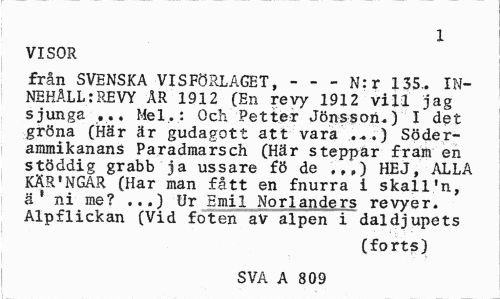 //// 1 //// VISOR //// från SVENSKA VISFÖRLAGET,---N:r 135.. INNEHALL: REVY ÅR 1912 (En revy 1912 vill jag sjunga ... Mel.: Och Petter Jönsson.) I det gröna (Här är gudagott att vara .*.) Söder-ammikanans Paradmarsch (Här steppar fram en stöddig grabb ja ussare fö de ,,,) HEJ, ALLA KÄR'NGAR (Har man fått en fnurra i skall'n, ä' ni me? ...) Ur Emil Norlanders revyer. Alpflickan (Vid foten av alpen i daldjupets //// (forts) //// SVA A 809 ////