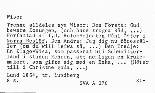 //// Wisor //// Trenne alldeles nya Wisor. Den Första: Gud beware Konungen, (och hans trogna Råd, ...) Författad af f.d. Rote=Soldaten Påhl öster i Norra Reslöf. Den Andra: Jag dig nu föreställer (om du will lefwa så, ...) Den Tredje: En Klago=Wisa, som passerat uti Schweitzer-land i staden Mehren, att nemligen en Krukc-makare, som gifte sig med en Enka, ... (Hörer till i Christne goda, ...) //// Lund 18 34, tr. Lundberg //// 8 S* SVA A 37 0 8:~ ////