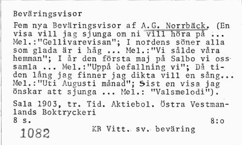 //// Beväringsvisor //// Fem nya Beväringsvisor af A.G. Norrbäck. (En visa vill jag sjunga om ni vill höra på ... Mel.:"Gellivarevisan"; I notdens söner alla som glada är i håg ... Mel.:"Vi sålde våra hemman"; I år den första maj på Salbo vi oss samla ... Mel.:"Uppå befallning vi"; Då tiden lång jag finner jag dikta vill en sång... Mel.:"Uti Augusti månad"; 5ist en visa jag önskar att sjunga ... Mel.: "Valsmelodi"). //// Sala 1903, tr. Tid. Aktiebol. östra Vestman-lands Boktryckeri //// 8 s. 8:0 //// 1Q8P Vitt. sv. beväring ////
