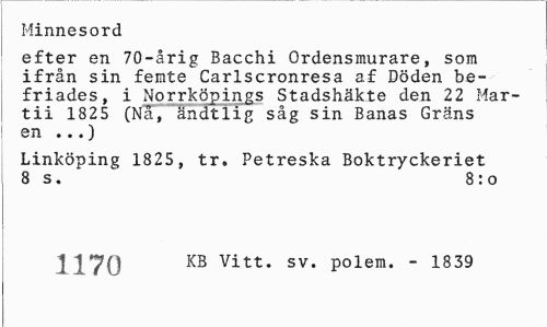 //// Minnesord //// efter en 70-årig Bacchi Ordensmurare, som ifrån sin femte Carlscronresa af Döden befriades, i Norrköpings Stadshäkte den 22 Mar-tii 1825 (Nå, ändtlig såg sin Banas Gräns en ...) //// Linköping 1825, tr. Petreska Boktryckeriet 8 s. 8:o //// 1170 KB vitt- sv- Polem. - 1839 ////