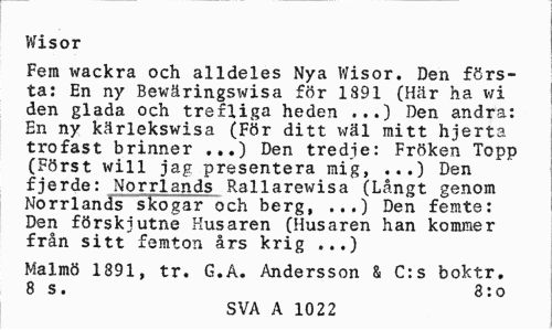 //// Wisor //// Fem wackra och alldeles Nya Wisor. Den första: En ny Bewäringswisa för 1891 (Här ha wi den glada och trexliga heden ...) Den andra: En ny kärlekswisa (För ditt wäl mitt hjerta trofast brinner ...) Den tredje: Fröken Topp (Först will jag presentera mig, ...) Den fjerde: Norrlands Rallarewisa (Långt genom Norrlands skogar och berg, ...) Den femte: Den förskjutne Husaren (Husaren han kommer från sitt femton års krig ...) //// Malmö 1891, tr. G.A. Andersson & C:s boktr. 8 s . 8: o //// SVA A 1022 ////