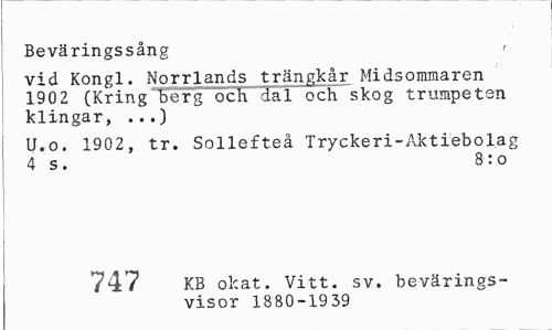 //// Beväringssång //// vid Kongl. Norrlands trängkår Midsommaren 1902 (Kring berg och dal och skog trumpeten klingar, ...) //// U.o. 1902, tr. Sollefteå Tryckeri-Aktiebolag 4 s. S:o //// 747 KB okat. Vitt. sv. bevärings- //// visor 1880-1939 ////