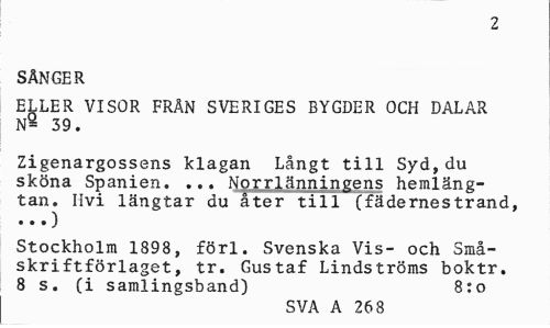 //// 2 //// SÅNGER //// ELLER VISOR FRÄN SVERIGES BYGDER OCH DALAR N- 39. //// Zigenargossens klagan Långt till Syd, du sköna Spanien. ... Norrlänningens hemlängtan. Ilvi längtar du åter till (fädernestrand, //// Stockholm 1898, förl. Svenska Vis- och Småskriftförlaget, tr. Gustaf Lindströms boktr. 8 s. (i samlingsband) 8:o //// SVA A 268 ////