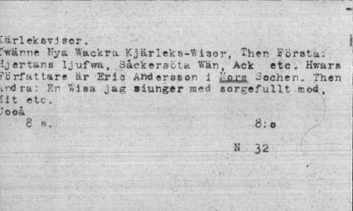 //// kärlek sv j ser. //// 'warne Kya Wackra Kjärleks-tisor, Then Första; [jertans Ijufwa, öåekersöta Wän, Ack etc, Hwars 'crfattare är Er is Andersson i t'fl,pg 3ochen, Then .»-dra: En 7»isa jag siunger med sorgefullt mod, 'it etc, 'ooå //// 8 s. 8:0 //// N 32 ////