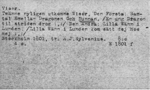 //// Visor. //// Twänne nyligen utkomne Wisor, Den Första; Samtal Emellan Dragonen Och Nunnan. /En ung Dtagon til striden drog ; , ;/ Ben Lilla Wänn i //// Lunden . /Lilla Wänn i Lunden kom sätt dej Hos mej ; ,:/ //// Stockholm iSOl, tr. a.J.Sylvenius. B:o 4 s. E 1801 f //// » • : , y -C ; V < ////