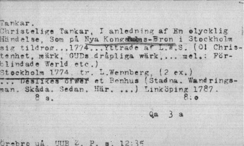 //// tankar. //// 'hristelige Tankar, I anledning af En ©lycklig {'ändelse, Som på Nya KongrsfiMtes-lfron i Stockholm sig tildrop. . .177<7777ttrs7r"arT!T.S. (0| Chris-t enhet, mark, GtJDs dråpliga wärk , . ., ra el,: Förlindade Werld etc.) //// Stockholm 1774 tr. L.Wennberg, (2 ex.) //// r:: 'Iteslikea 6t"*?ér et P^nhus (Stadna. Wanérings- //// lan, Skåda. Sedan. Här. ...) Linköping 1787. 8a. 8;o //// Q,a 3 a //// •. - -v, .-, ¦. r rrrrp - 13 .. i > • '3 c ////