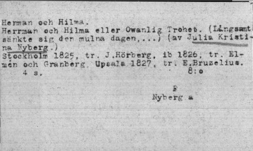 //// Herman oeh Hil-na. //// Herraar och Hilma eller Owar.li^ Trohet. (Langsant sänkte sig der mulna dagen,...) (av Julia Kristi na Nyberg .) ' //// StocWoIm 1825, tr. J.Hörberg, ib 1826, tr. El-nién och Granberg Uptala 1827, tr. E.Bruselius. 4 s. 8;o //// S //// Nyberg a ////
