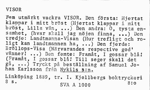 //// VISOR //// Fem utmärkt vackra VISOR. Den första: Hjertat klappar i mitt bröst (Hjertat klappar i mitt bröst, Lilla vän, ...) Den andra: O, tysta ensamhet, Chvar skall jag nöjen finna, ...) Den tredje: Landtmanna-Visan (Hur trefligt och roligt kan landtmannen ha, ,..) Den fjerde: Bröllops-Visa (Närvarandes respective god1 vänner.' ...) Den femte: Framåt, I gossar blå i (Framåt, I gossar blå.' Till seger skall det gå, ...) Tryckt på beställning af Samuel Johan Karlsson från Nykils s:n. //// Linköping 1889, tr. I. Kjellbergs boktryckeri //// 8 S' SVA A 1000 8:0 ////
