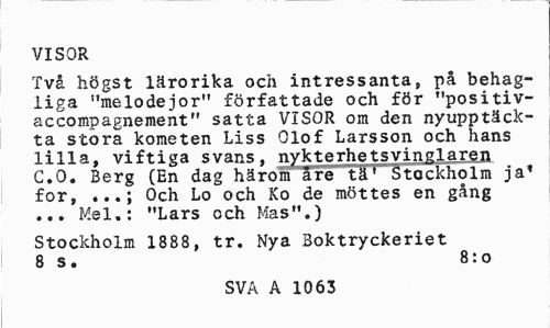 //// VISOR //// Två högst lärorika och intressanta, på behagliga "melodejor" författade och för "positiv-accompagnement" satta VISOR om den nyupptäckta stora kometen Liss Olof Larsson och hans lilla, viftiga svans, nykterhetsvinslaren C.O. Berg (En dag härom are tä1 ätocKholm ja* for, ...; Och Lo och Ko de möttes en gång ... Mel.: "Lars och Mas".) //// Stockholm 1888, tr. Nya Boktryckeriet 8 s. 8:0 //// SVA A 1063 ////