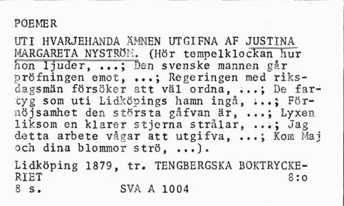 //// POEMER //// UTI HVARJEHANDA ÄMNEN UTGIFNA AF JUSTINA MARGARETA NYSTRÖM. (Hör tempelklockan^hur hon ljuder, ..*.";" Den svenske mannen går pröfningen emot, Regeringen med riks- //// dagsmän försöker att väl ordna, De far- //// tyg som uti Lidköpings hamn ingå, För- //// nöjsamhet den största gåfvan är, Lyxen //// liksom en klarer stjerna strålar, Jag //// detta arbete vågar att utgifva, Kom Maj //// och dina blommor strö, ...). //// Lidköping 1879, tr. TENGBERGSKA BOKTRYCKERIET 8:0 8 s. SVA A 1004 ////
