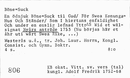 //// Böne=Suck //// En ödmjuk Böne=Suck til Gud/ För S\*ea Xonunga= Hus Och Ständer/ Som I hiertans enfaldighet Och under en enslig lefnad YttrAS Wid et wäl-signat Nyårs anträde 1753 (Nu börjas här et åhr uti wårt Swea Rike, ...) //// Westerås u.å., tr. Joh. Laur. Horrn, Kongl. Consist. och Gymn. Boktr. 4 s. 8:0 //// onr» KB okat. Vitt. sv. vers (tal) //// OUb kungl. Adolf Fredrik 1752-68 ////