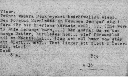 //// Visor. //// Tvänne waekra Dock Rycket bedrofveliga Wisor, Den Första; i£...ruledéi Konungs 3«n gaf sig i fara fer sin hjsrtan» käraste skul, ... (The vore tu Ädle K«nu ng« barn,...) Den Andra; Om en Konungs Bottor, hurulodos hon... blef förvandlad til »n Nächtergal.,. (Jag vet wal hvar so» står ett 31 otl. T.' mef.; Thet ligger ett Slott l Öster-fik' etc.) CJooå //// 8 s, t: o //// \ \ . / ^ v - ,¦ A -3© ,. • ////