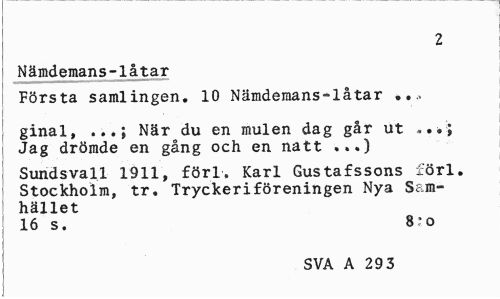 //// 2 //// Nämdemans-låtar //// Första samlingen. 10 Nämdemans-låtar ... //// ginal, ...; När du en mulen dag går ut Jag drömde en gång och en natt ...) //// Sundsvall 1911, förl, Karl Gustafssons förl. Stockholm, tr. Tryckeriföreningen Nya Samhället //// 16 s. S:o //// SVA A 293 ////