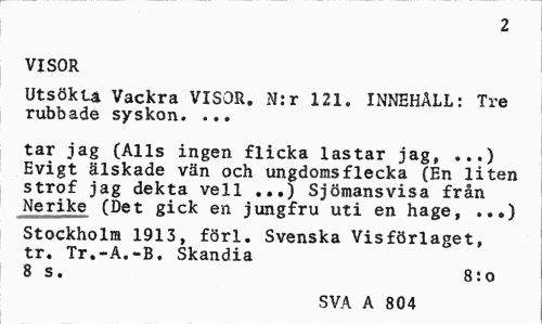 //// 2 //// VISOR //// UtsökLä Vackra VISOR. N:r 121. INNEHÅLL: Tre rubbade syskon. ... //// tar jag (Alls ingen flicka lastar jag, ...) Evigt älskade vän och ungdorasflecka (En liten strof jag dekta vell ...) Sjömansvisa från Nerike (Det gick en jungfru uti en hage, ..?) //// Stockholm 1913, förl. Svenska Visförlaget, tr. Tr.-A.-B. Skandia //// 8 s. 8: o //// SVA A 804 ////