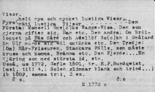 //// Visor. //// /helt nya och mycket lustiga Wisor //// ?yr3^rätt 1 ti» t i ra f i ja or ---Den //// Först»; Mamsell Sme(c7ks Wagge-Wisa. D«n som gjerna gifter sig, Har etc. Den Andra; 0» Brcl-loppet på Ea Gård ocb Adellcf 3o(c)kn i Småland En Ulf m&rSPi l!(f Wäl antärk® etc. Den Tredje: (Om) Hår-Friseuren. Stackars Pälle, som måste krusa och kamma, Bränna etc. Den Fjerde;.,.En Kjäring som med största id, etc. Uooå, uo 17? 2» 3ef le iBOl, tr. K.P.Sundqwist, (mel. till 4.; Solen glimmar blank och trind...) ib l80?, samma tr:i, 2 ex. //// 8 s. 8; c //// E 1772 o ////