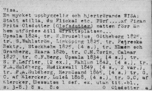 //// Vi sa. //// En mycket uppbyggel i t? och hjertrörande WI3Å; Statt stilla, du Plickal etc. Förf..,,a.f Pigan Brita Olsdotter (natten förr än hem utförde» A ill åTfUtls platsen,.. Upsula 1824, tr. F.Bruzelius, Gotheborg 182^, tr. S.Wahlström, Linköping 182^, tr. Petreska Bektr., Stockholm l8?5, (4 s.), tr. Elrnén ©ch Granberg, Skara 1826, tr. C.M.Tori», Calmar 1827, tr. C.F.Berg, Upsala 1834, (4 s.), tr. S. P.Leffler, (2 ex.), Fahlun 1842, (4 s.}, tr. ?.A.Huldberg, Hudiksvall 1849» (4 s., 2 var.), tr. P.a,Huldberg, Hernösand 1865, (4 s.) tr. G, C. af KlerckerLuleå l8ö8, (4 s.), tr.- G.C. af tvlercker, (Dessutom 1 cief. ex. utan tit,-bl., s. 1-8.) 8 s, 8; o 0 Olsdotter a. ////