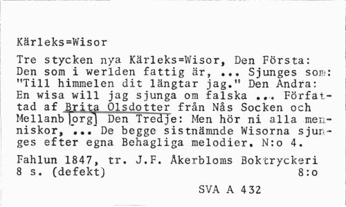 //// Xärleks=Wisor //// Tre stycken nya Kärleks=Wisor, Den Första: Den som i werlden fattig är, ... Sjunges sop.': "Till himmelen dit längtar jag." Den Andra: En wisa will jag sjunga om falska ... Författad af Brita Olsdotter från Nås Socken och Mellanb |orgl Den tredje: Men hör ni alla men-niskor, .."De begge sistnämnde Wisorna sjunges efter egna Behagliga melodier. N:o 4. //// Fahlun 1847, tr. J.F. Åkerbloms Boktryckeri 8 s. (defekt) 8:o //// SVA A 4 32 ////