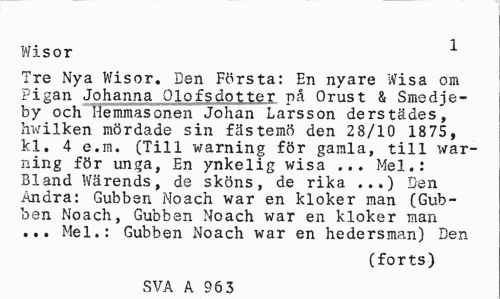 //// Wisor 1 //// Tre Nya Wisor. Den Första: En nyare Wisa om Pigan Johanna_01ofsdot.ter på Orust & Smedje-by och Hemmasonen Johan Larsson derstädes, hwilken mördade sin fästemö den 2 8/10 1875, kl. 4 e.m. (Till warning för gamla, till varning för unga, En ynkelig wisa ... Mel.: Bland Wärends, de sköns, de rika ...) Den Ändra: Gubben Noach war en kloker man (Gubben Noach, Gubben Noach war en kloker man ... Mel.: Gubben Noach war en hedersman) Den //// (forts) //// SVA A 56 3 ////