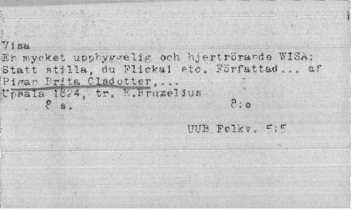 //// Visa //// Er. mycket och hj ert rörande WISA: //// Statt stilla, du Flickal etc. Författade, af Pi^an Brita Clad utter ... Uppaia tr. K.Fruzelius //// F a. * P;o //// UUB Folfcv. ////