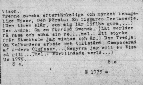 //// V i 8 or. //// Trenne ganska eftertänkeliga och mycket tehage-lige Wisor, Pen Första; En Tiggares Testamente. (Den timen siar, som.mig lär iiflbs göra,...} Den Andra; Om en förnögd Swenslc. {Lät -werlden få rasa och söka sin ro,»..mel.; Ett stycke från Stockholm jag wistas och är.) Den Tredje; Om Koleendens arbete och tillstånd. Componerad a.r Anders Olofaaor...(Begynna jag will en Wisa ea gi 11 ,. .".mel.; FSrV 1 i^dade werldk ..) Uc 1775- //// 8 s. 8; o //// E 177? a ////