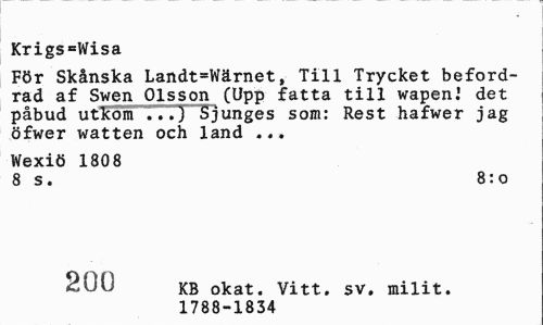 //// Krigs^Wisa //// För Skånska Landt=Wärnet, Till Trycket befordrad af Swen Olsson (Upp fatta till wapen.1 det påbud utkom 777} Sjunges som: Rest hafwer jag öfwer watten och land ... //// Wexiö 1808 //// 8 s. 8: o //// 200 KB okat. Vitt. sv, milit. //// 1788-1834 ////