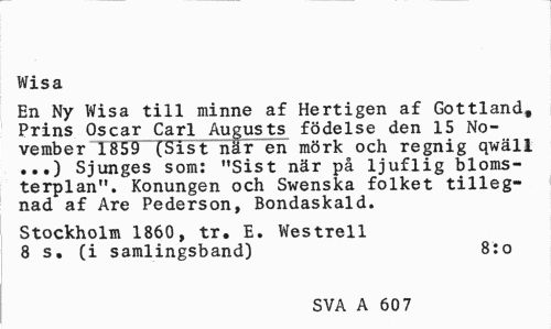 //// Wisa //// En Ny Wisa till minne af Hertigen af Gottland* Prins Oscar Carl Augusts födelse den 15 November 1859 (Sist när en mörk och regnig qwäli ...) Sjunges som: "Sist när på ljuflig blomsterplan". Konungen och Swenska folket tilleg-nad af Are Pederson, Bondaskald. //// Stockholm 1860, tr. E. Westrell 8 s. (i samlingsband) 8:o //// SVA A 607 ////