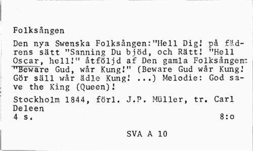 //// Folksången //// Den nya Swenska Folksången: "Hell Dig.' på fäd-rens sätt "Sanning Du bjöd, och Rätt! "Hell Oscar, hell!" åtföljd af Den gamla Folksångem "Beware Gud, wår Kung!" (Beware Gud wår Kung! Gör säll wår ädle Kung! ...) Melodie: God sa-ve the King (Queen)! //// Stockholm 1844, förl. J.P. Muller, tr. Carl Deleen //// 4 s< 8:0 //// SVA A 5 10 ////